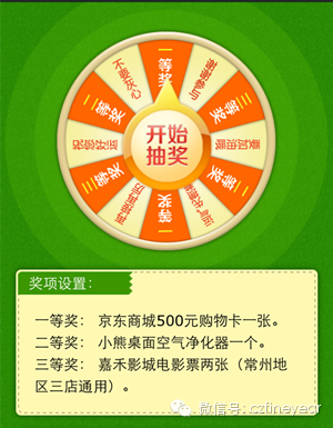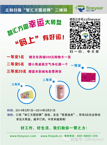 3.1日起至3.31日,订阅“智汇方圆招聘”微信(微信号:czfineyear, 或点击本文标题下面的蓝色小字“智汇方圆招聘”快速关注),发送“我要抽奖”,即有机会收获大惊喜,获赠京东商城500元购物卡一张!转动您的幸运大转盘,还有可能获赠小熊桌面空气净化器和嘉禾影城电影票!一共三次抽奖机会,每天只能抽奖一次。越早订阅,中奖率越高哦~~祝您人品爆发,好运爆棚,马到成功^-^